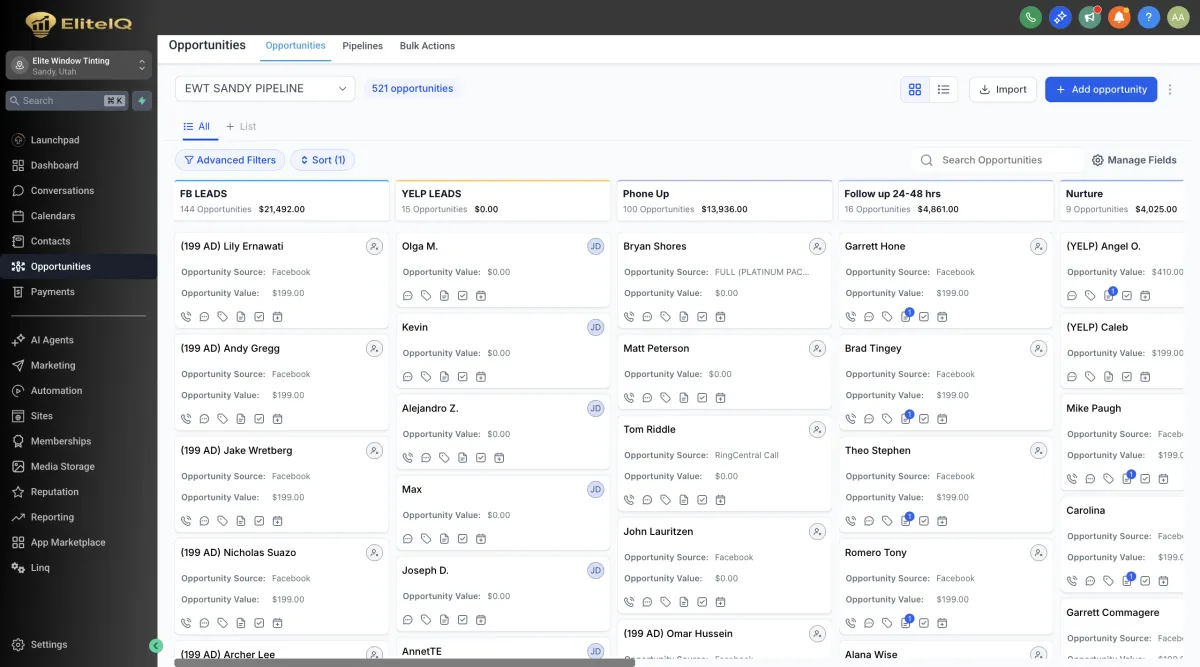 Whether you're in services, e-commerce, automotive, local business, coaching, real estate, or agency work, EliteIQ adapts to your processes. Build pipelines, funnels, campaigns, and automations that match exactly how your business operates.